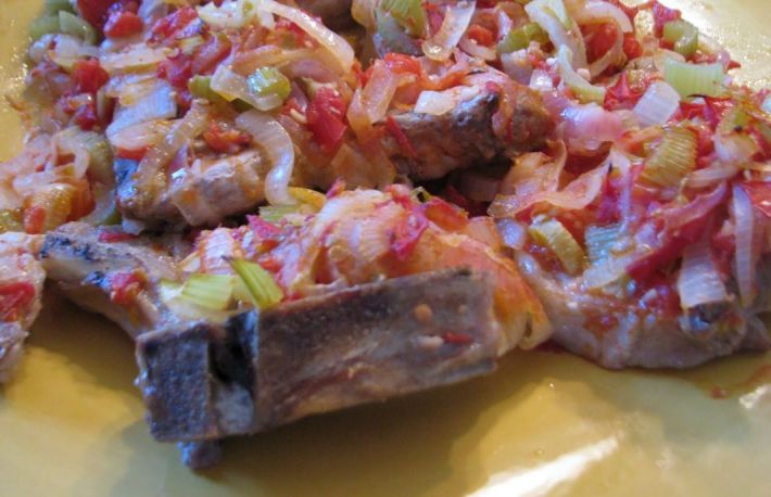 Creierul rumenit impreuna cu ceap se serveste cu garnitura de legume asortate.