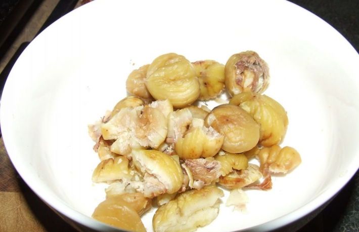 Se scoate din coaja miezul fierbinte, se sfarama intr-un castron cu o lingura de lemn si se freaca bine, adaugand zaharul pana se face ca o crema.