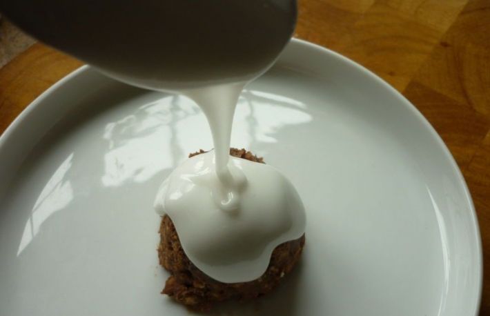 Se taie o deschizatura foarte mica la varf si se plimba cornetul deasupra tortului, strangandu-l usor cu mana ca sa iasa un fir egal de glazura.