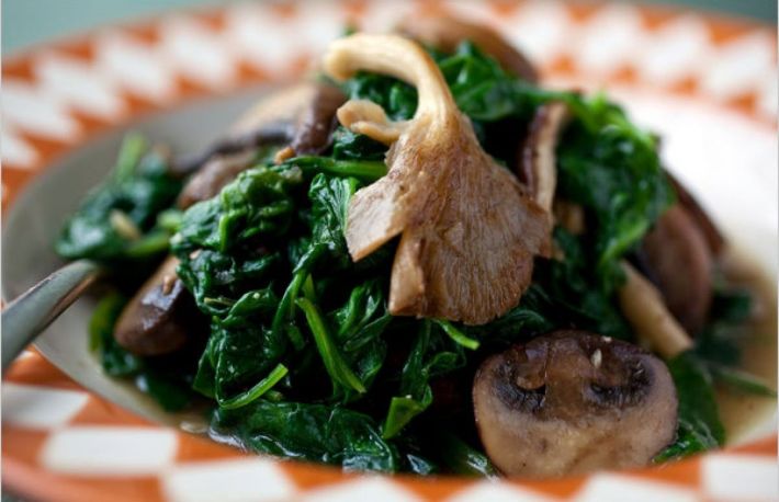 Se amesteca spanacul cu ciupercile, se adauga branza rasa si o lingura de unt.