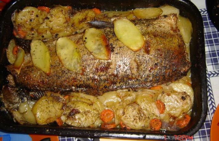 Se pune intr-o cratita lunga la fiert, cu apa si sare, zarzavat si cartofi si toate oasele care s-au scos din peste. Se lasa sa fiarba.