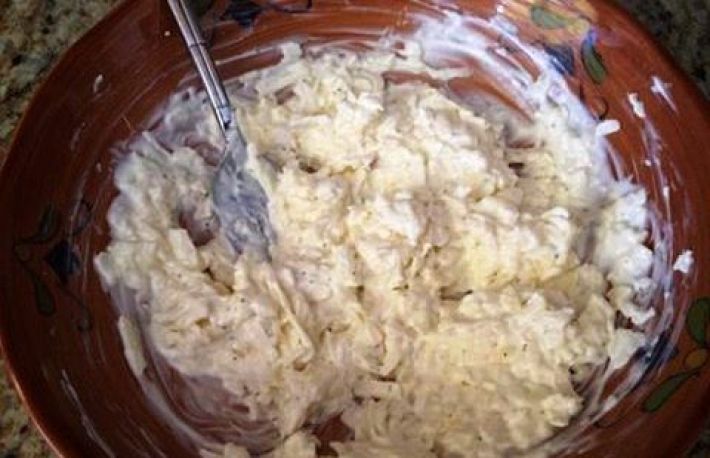 - pune marul astfel ras si stors intr-o farfurie adanca impreuna cu usturoiul si amesteca usor cu o furculita impreuna cu celelalte ingrediente.