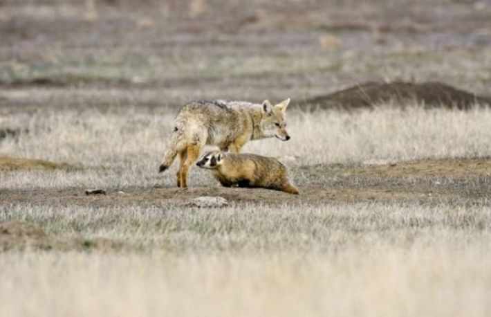 Coiotii pot vana impreuna cu bursucii. Intr-un basm al indienilor din America, se spune ca intre bursuci si coioti exista prietenie. Se intampla chiar si in realitate! Cele doua animale vaneaza impreuna. Eficienta e sporita, asa! Bursucul poate intra dupa prada in vizuini, in timp ce coiotul poate urmari foarte bine animalele de pe sol. Asadar, bursucul alunga prada din ascunzatoare, iar coiotul ii aplica lovitura decisiva pe teren deschis.